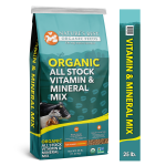 All Species: In addition to Nature’s Best Organic All Stock Vitamin & Mineral Mix, provide pasture, hay, or other quality forage at a minimum rate of 2.0% body weight per head per day. Avoid any drastic changes to animal’s diet, and adjust intake based on body condition and production needs. Do not overfeed. Not a complete feed – additional grains, vitamins and minerals may be necessary in some areas.