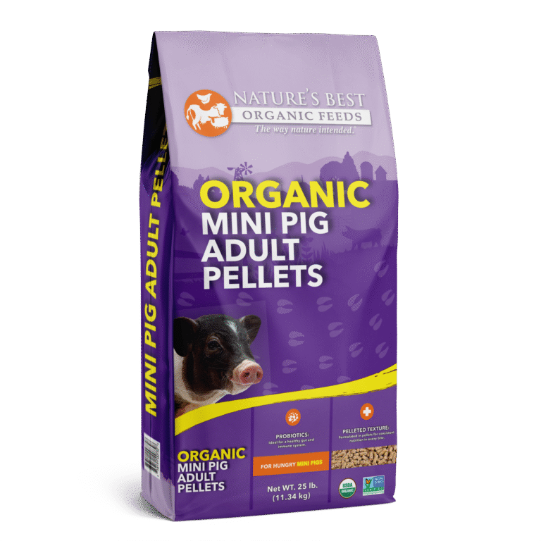 Nature’s Best Organic Mini Pig Adult Pellets are a complete feed. Feed to adult mini pigs four months of age or older. To maintain weight, feed quantity should be 1-2% of pig’s body weight. Provide fresh, clean water at all times.