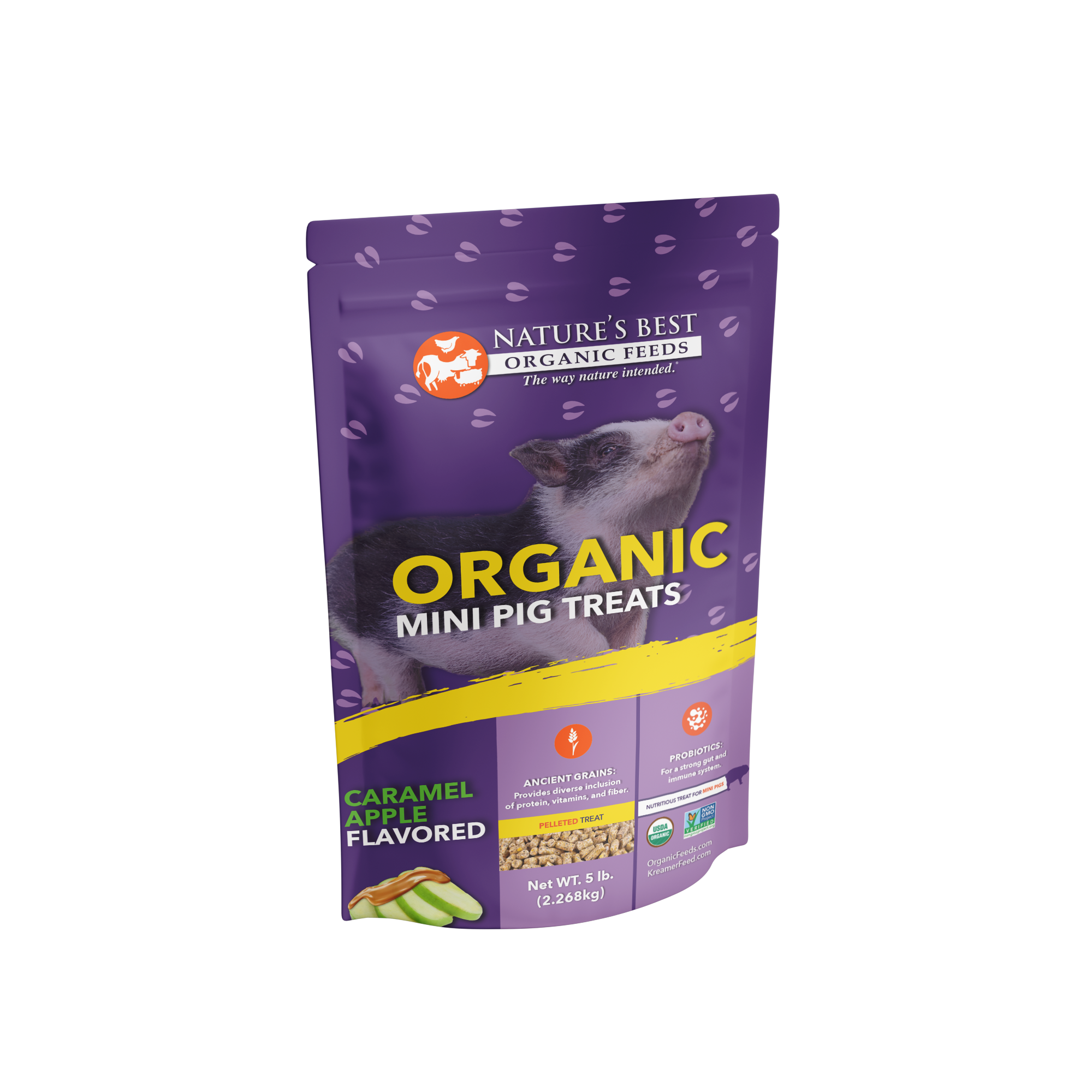 Nature’s Best Organic Mini Pig Treats are intended as a supplemental product for your mini pigs in addition to their complete diet. For optimal nutrition, we recommend adding these treats to a diet of Nature’s Best Organic Mini Pig Adult Pellets or Nature’s Best Organic Mini Pig Young and Active Pellets, also sold at Tractor Supply. These treats provide your mini pig with probiotics and prebiotics to help develop a healthy gut and immune system. And thanks to the delicious caramel apple flavor, pigs are sure to love the taste. Great for mini pigs of all ages after weaning.